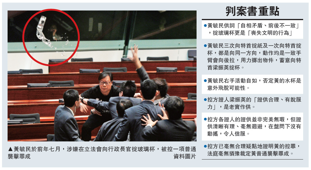 裁判官认为,被告在议事厅内掟玻璃杯,显然比掟纸更激烈,是丧失文明的行为,被告在所不计、罔顾后果,向梁振英掟玻璃杯,令梁会当场遭受即时及非法武力的侵犯,控方已毫无合理疑点地证明被告的控罪,法庭毫无犹豫裁定被告普通袭击罪成。被告准以原条件保释外出,押至下周二判刑。