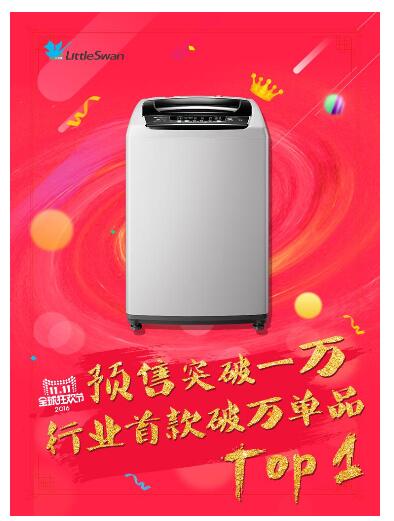 从全球第三大洗衣机制造商小天鹅2016年双十一的预售情况来看,预售开启仅仅6天,首个破万单品已经诞生,同时这也是天猫双十一洗衣机行业首个破万单品。小天鹅以黑马之姿问鼎双十一预售冠军,王者之位无可撼动。21日预售活动开始之时,小天鹅的三款洗衣机产品就一直处于洗衣机行业遥遥领先的地位,预售数量也是一路飙升。截止到目前为止,洗烘一体机TD80-Mute160WDX预售量高达8200台,滚筒洗衣机TG80V61WDX预售量高达8900台,霸主之姿尽显!