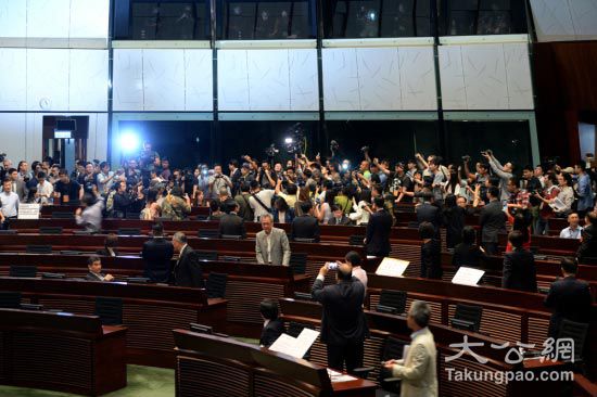 反对派议员策划护送梁游闯议事堂的丑剧,致使立法会秩序失控,传媒数十人涌入立会,造成空前的大混乱。大公报记者林良坚摄