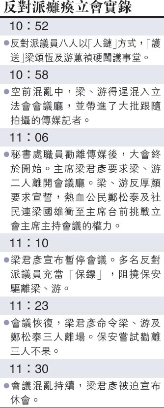 梁颂恒、游蕙祯硬挤入会议厅后便一直厚颜占住座位不走,其他反对派议员充当了二人的保镖,扰攘了好一段时间。会议迟了六分钟开始。梁君彦先宣布驱逐梁、游两人,而反对派则提抗议并阻扰保安人员将他们带离会议厅,其中热血公民郑松泰更走近主席台质问梁君彦。梁君彦宣布暂停会议。其后会议恢复,梁君彦以行为不检驱逐郑松泰,郑则返回座位赖着不走,多名保安员要求其离开不果。大会混乱持续至11时半,未能进入任何议程,梁君彦最后宣布休会。立法会大会连续两个星期无法进行,被梁君彦裁定可再誓的刘小丽亦未完成宣誓。