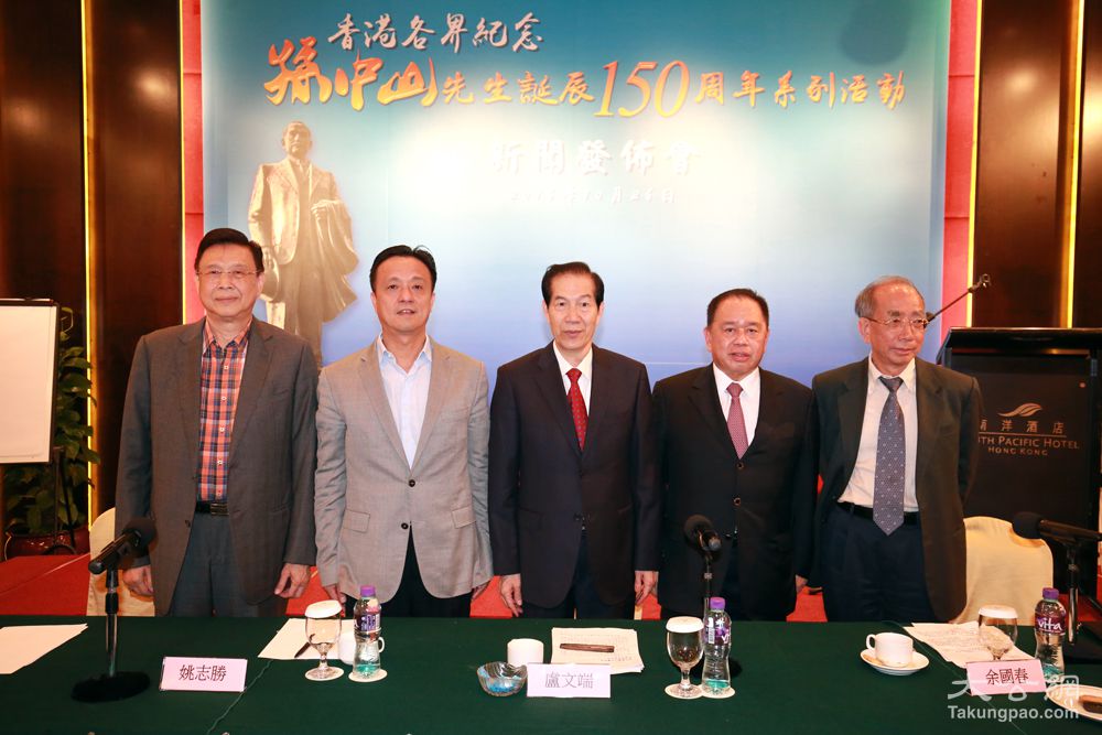 图左起:香港各界纪念孙中山先生诞辰150周年系列活动筹备委员会执行副主席梁淦基、姚志胜、执行主席卢文端和余国春、执行副主席李润基 /大公报记者麦润田摄