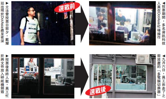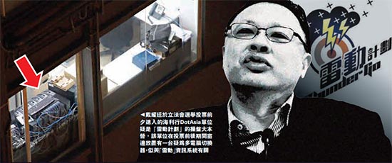 图:戴耀廷于立法会选举投票前夕进入的海利行DotAsia单位疑是雷动计划的操盘大本营,该单位在投票前后期间窗边放置有一台疑为多电脑切换器,似与雷动资讯系统有关