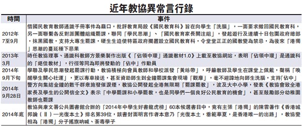 不过,自2012年反国教事件以来,教协路向明显与往年不同,尤其前年的非法占中上,教协甚至一度煽动全港中小学无限期罢课罢教,行为令人侧目。