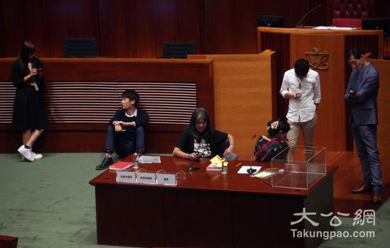 游蕙祯(左一)、梁颂恒(左二)宣誓时的反中辱华举动,触及国家统一及领土完整底线,必须严惩。资料图片
