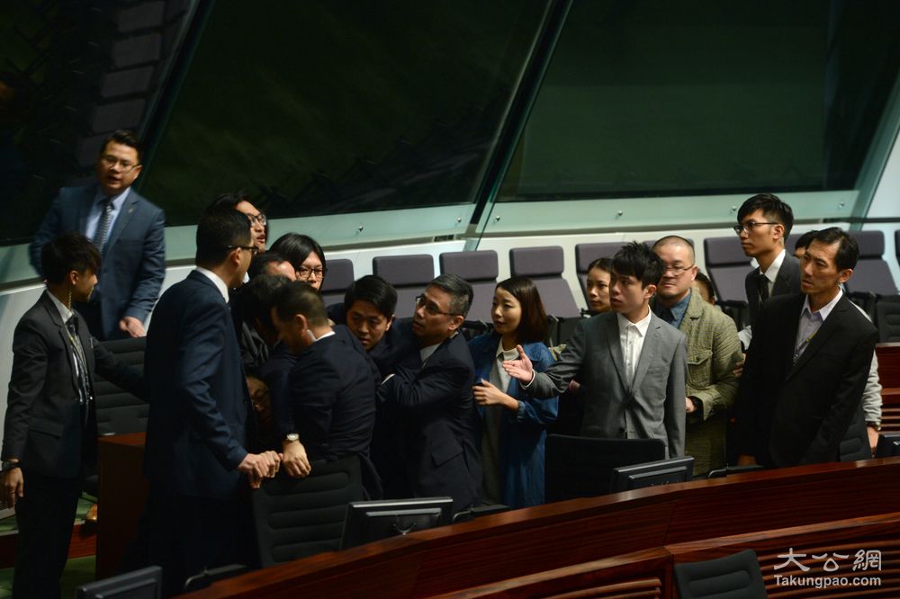 图:反对派昨天又在立法会大会搞事,当民主党许智峯(红圈)被主席裁定违反议事规则,须离开议事厅后,多名反对派议员一拥而上阻止秘书处人员执行职务,大会因混乱而被迫暂停\大公报记者何嘉骏摄