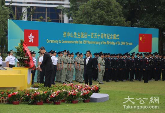 大公网11月13日讯(记者 吴维思)为纪念孙中山先生诞辰150周年,特区政府12日在中山纪念公园举行官方纪念仪式,全国政协副主席董建华、行政长官梁振英、中联办主任张晓明、解放军驻港部队司令员谭本宏等约二千人出席仪式。梁振英致辞时表示,希望年轻人通过参加孙中山诞辰的活动,全面学习孙中山的伟大事迹和爱国情操,并相信香港市民必定秉承中山先生遗志,弘扬爱国精神,用好一国两制的双重优势。