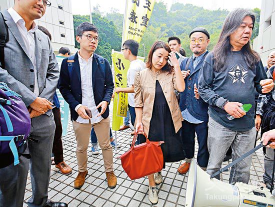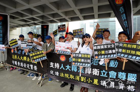 保护香港运动成员昨早在高院外请愿,不满刘小丽以龟速读誓词,促请法庭取消刘小丽议员资格。大公报记者林良坚摄