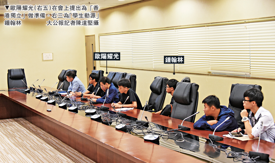 欧阳耀光(右五)在会上提出为香港独立做准备。右三为学生动源钟翰林/大公报记者 陈达坚摄