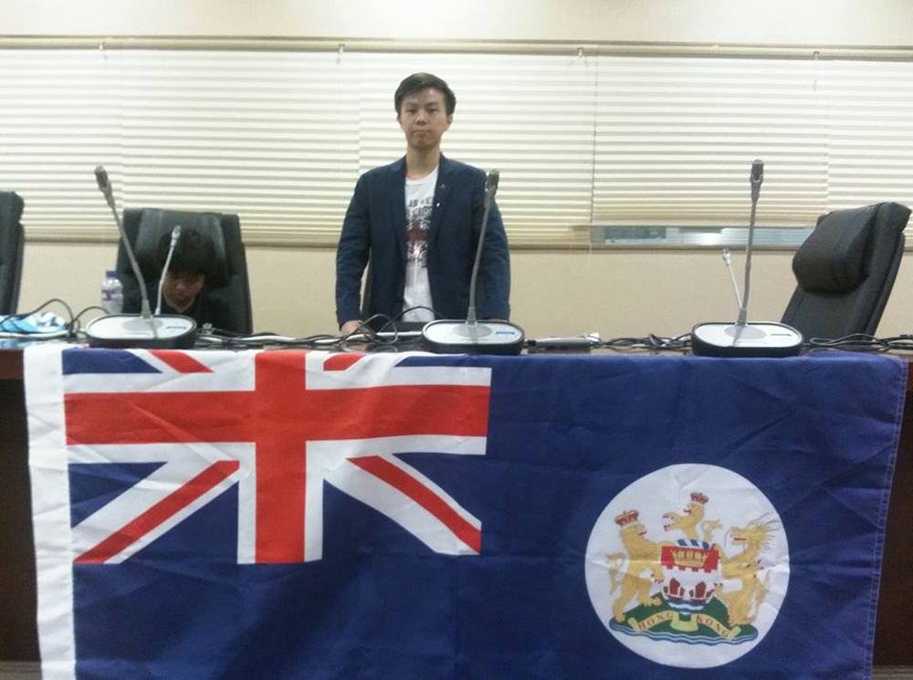 在中学生议会选举中,以132票当选的欧阳耀光,除了是一名中学生外,他亦是港独组织学生动源发起人之一。欧阳耀光的港独心,在中学议会的政纲上表露无遗,他写道,本土理念乃大势所趋,他希望以中学生身份,把本土立场带进中学生议会。昨日,他的选举承诺果然兑现,在首次会议中,他带着港英旗开会,开会后更不忘与旗帜合照,放上facebook呃like。