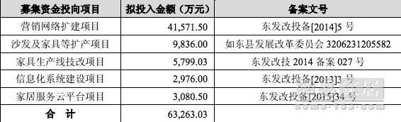 亚振家具本次募集资金6.33亿元,主要用于营销网络扩建项目(4.16亿元)、沙发及家具等扩产项目(9836万元)、家具生产线技改项目(5799万元)、信息化系统建设项目、家具服务云平台项目,其中,沙发及家具等扩产项目达产后,每年将新增产能4万余件。