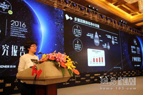 北京中怡康时代市场研究有限公司厨卫事业部总经理施婷女士现场发布数据报告。报告内容从多维度对净水器我国业现状、净水器市场供需状况、净水器产业链现状、净水器重点企业状况等内容进行详细的阐述和深入的分析,着重对净水器市场发展动向作详尽深入的分析。《2016中国净水行业产业发展研究报告》的发布,具有指导性和方向性的重大意义。