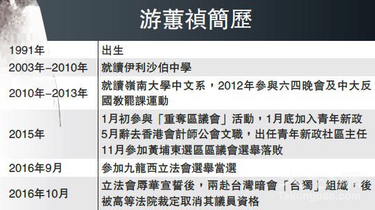 至于游蕙祯2012年往中大参与反国教罢课,当时游认为难得有一群学生领袖走出来,并认为这是社运种子开始萌芽。2014年爆发占中,于香港会计师公会任文职的游,每日放工由办公室往金钟参与占中,又彻夜留守旺角占领区。占中完结,她的政途却开始,15年1月初游受到岭大前学长号召,加入油尖旺区议会重夺行动小组,一月底,游与重夺小组成员加入梁颂恒创办的青年新政。