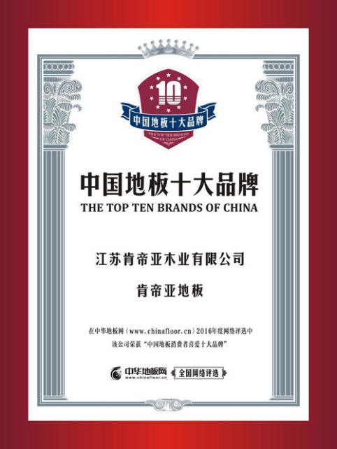 在由权威行业门户网站——中华地板网举办的2016“中国十佳品牌、中国十大品牌”大型全国网络评选中,肯帝亚从700多家成功参选的知名地板品牌中脱颖而出,实力荣登2016“中国地板消费者喜爱十大品牌”榜单,问鼎年度骄傲!