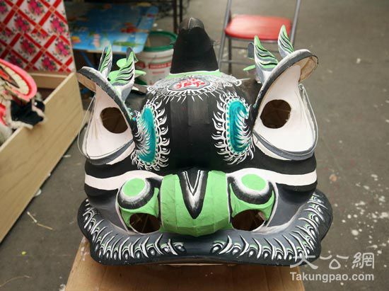 冒卓祺从小立志做一个纸扎师傅,不单纯是学习一种传统技艺,更多的是某种情怀。图为冒卓祺制作的狮头。大公网记者黄洋港摄