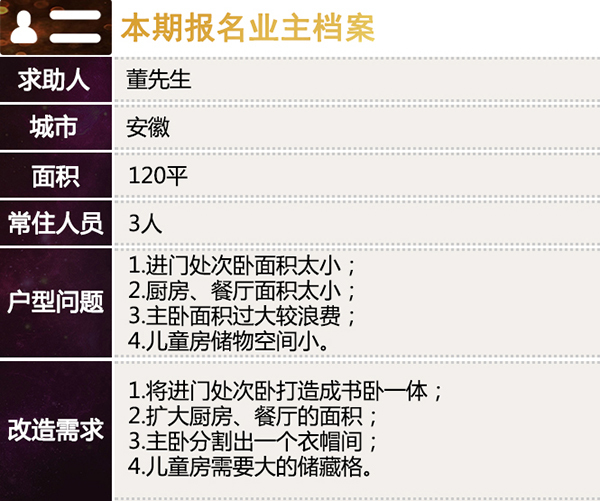 本期改造概述:本期案例是120平的三口之家,户型虽方正小问题却不少。业主董先生表示,原户型厨房餐厅太小了,儿童房则急需大量的储藏空间,同时主卧空间过大,希望增添衣帽间,次卧打造成书卧一体。经过与业主详细沟通后,丁梦公益设计师对户型进行了重新编排规划,给业主提供了两套满足业主所有要求的方案,让业主惊呼太神奇!