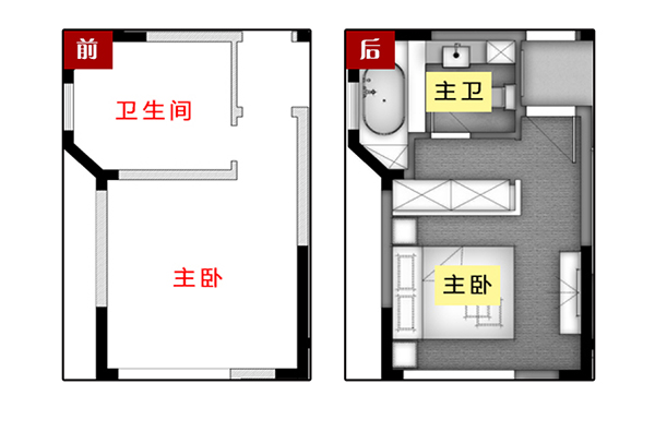 原户型中主卧空间过大,比较浪费,同时业主也希望增加一个衣帽间。于是设计师将主卫与房间的墙面做了些改动,分隔出一个衣帽间的空间。