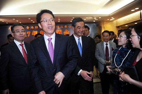 图:行政长官梁振英(左三),中联办主任张晓明(左二)、外交部驻港公署特派员宋哲(左一),以及香港各界知名人士出席酒会/中通社