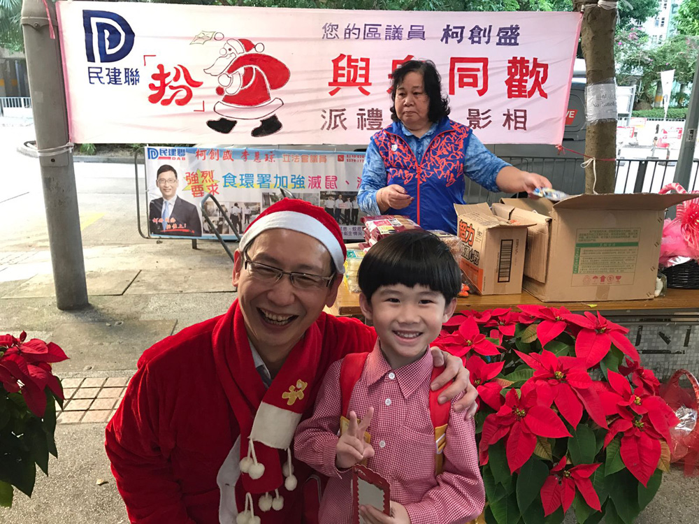 柯创盛则打扮成圣诞老人落区,他说是为了与街坊一同欢度圣诞,散播正能量。他在社交网站上和市民分享,说自己又扮圣诞老人,到德田街市同市民乐聚,不少市民见到他都表现得很开心,争相和他拍照留念。柯表示,过去16年从没停止这个圣诞节扮圣诞老人的活动,自己虽然已经由区议员升呢成为立法会议员,仍然会紧贴地区,做好工作。