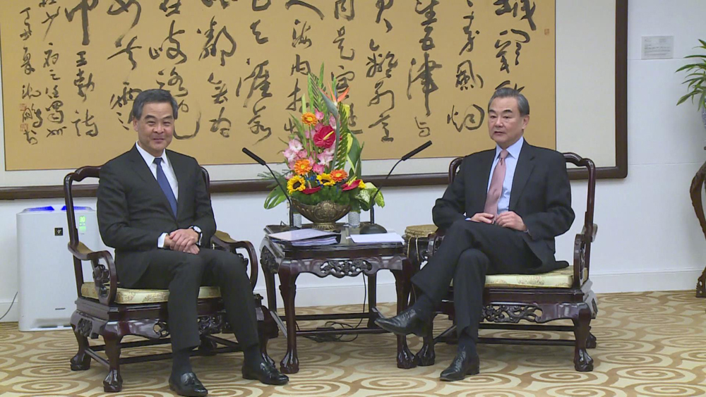 图:外交部部长王毅赞行政长官梁振英年轻有为,为国家和香港做大量有益工作