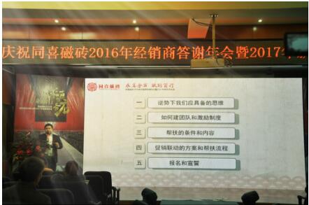 作为仿古砖十大品牌,同喜磁砖一直敢为人先。为更好应对2017年行业危机,抓住机会,同喜磁砖近日召开经销商年会,会上确定了“促销联动·逆势突围”市场战略思路,与广大经销商强强携手,提前备战2017年。
