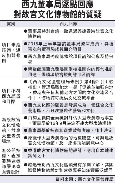 对于有声音质疑故宫馆并不符合西九文化区的初衷,发言人指出,根据《西九文化区管理局条例》,管理局其中一项职能是促进并加强内地、香港与任何其他地方之间的文化交流及合作,香港故宫文化博物馆除了加强香港与内地文化交流,更可让故宫博物院透过香港联系世界,符合西九文化区的愿景和目标。至于有评论指西九文化区应只注重现代艺术和文化,发言人强调绝无此说。