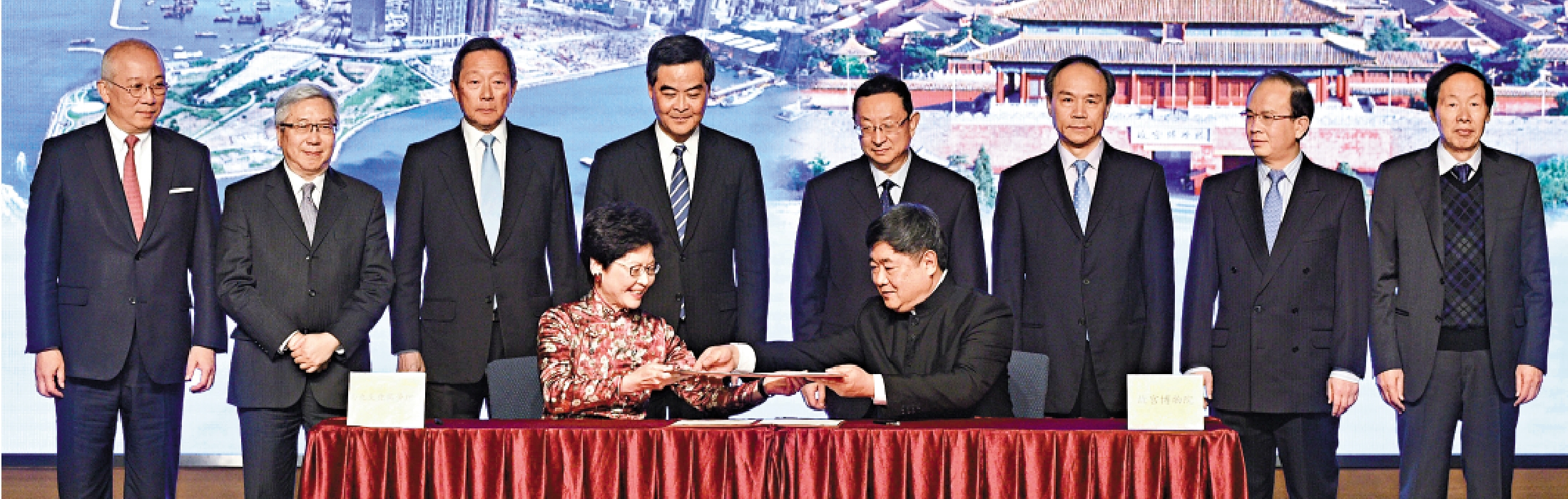 图:行政长官梁振英(后排左四)早前出席故宫博物院与西九文化区管理局就兴建香港故宫文化博物馆合作备忘录签字仪式。图示政务司司长林郑月娥(前排左)与故宫博物院院长单霁翔(前排右)在仪式上交换备忘录 资料图片