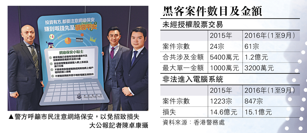 香港警方于去年1月至9月,接获未经授权股票交易案件有61宗,涉及交易额超过1.2亿元,相比2015年全年共24宗涉及5400万元,案件数目与涉及交易额均多出超过一倍。