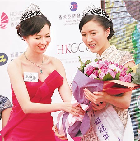 工展小姐冠军张欣欣(右)从上届冠军手中接过鲜花。彭子文摄