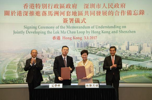《关于港深推进落马洲河套地区共同发展的合作备忘录》签署仪式昨日下午在添马舰政府总部举行,由政务司司长林郑月娥与深圳市副市长艾学峰签署,行政长官梁振英及深圳市委书记兼市长许勤见证,多名两地政府官员出席。