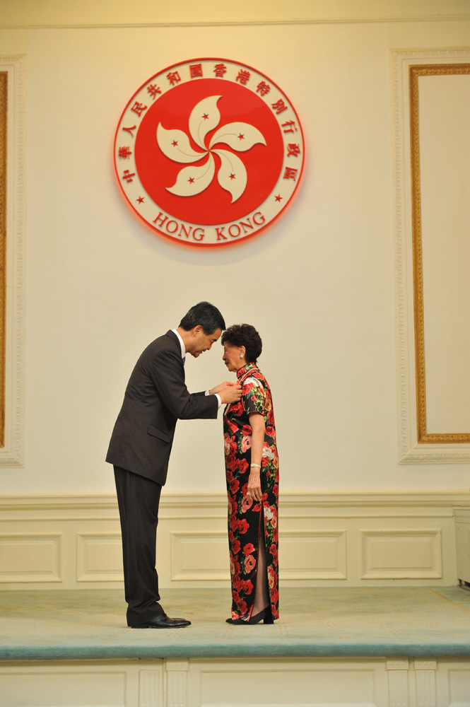 图:行政长官梁振英颁授银紫荆星章予费明仪