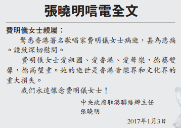 中联办主任张晓明昨晚亦向费明仪家属发出唁电,表示惊悉香港著名歌唱家费明仪女士病逝,甚为悲痛,谨致深切慰问。张晓明赞扬费明仪一生爱祖国、爱香港、爱声乐,德艺双馨,德高望重,形容她的逝世是香港音乐界和文化界的重大损失。我们永远怀念费明仪女士!