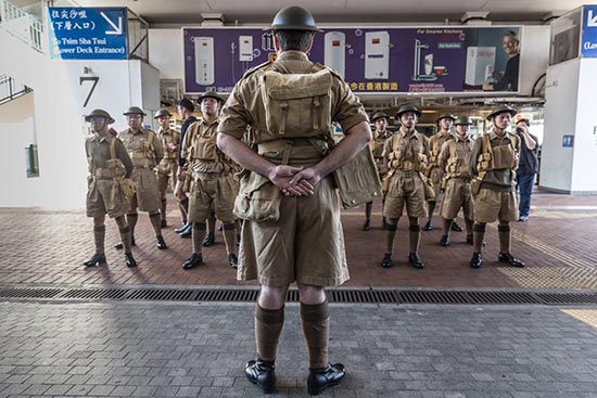 去年圣诞节当日,湾仔港铁站柯布连道出口聚集约二十名穿棕色军服、黑色军靴、戴上墨绿色头盔,衣袖綉有HKVD(香港义勇防卫军)的军人,吸引途人围观拍照。约十名戴圆帽的导赏员趁机向人群派发时代思进(Watershed Hong Kong)的卡片,又讲解1941年12月8日香港被日军入侵的防卫战历史。导赏员Cow声称他们是民间团体,大部分导赏员是大学生,义务参与时代思进扮演义勇防卫军的活动。Cow又说,香港回归后取消了重光纪念日假期,教科书、媒体又鲜见提及香港义勇防卫军,于是他们藉重光纪念日75周年,向市民重提本土历史。