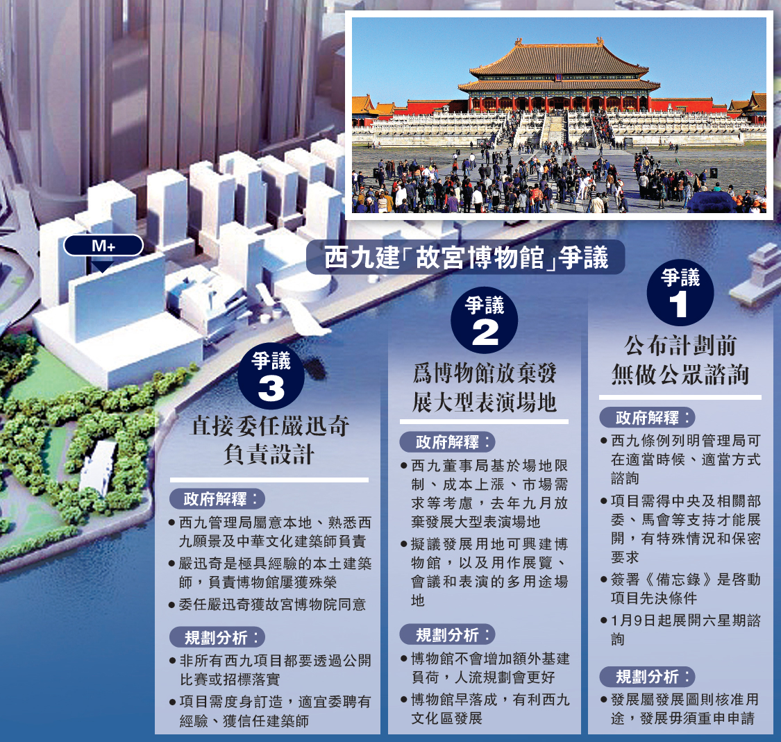 政府重申,放弃兴建大型表演场地基于技术和商业效益考虑,即使没有故宫文化博物馆,有关土地都会作其他发展。至于直接委任建筑师严迅奇为项目设计顾问,因管理局认为应该由对西九愿景及中华文化艺术有深刻了解的本地人担任,考虑到复杂的技术要求,及设计类似博物馆的经验,经咨询北京故宫博物院意见后,批准委任严迅奇,强调董事局是根据职权,依照程序作出决定。