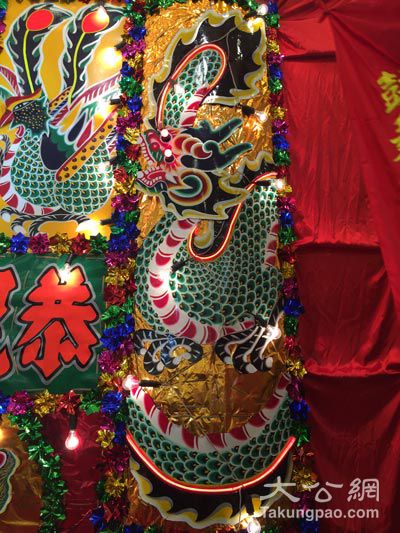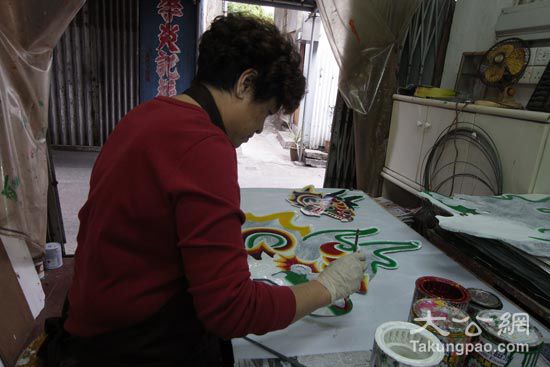 其实,制作花牌亦非外界想像那般简单。李翠兰拿着手中一个正在制作的花牌介绍:扎作一个花牌,需要写大字、摺花、制作配件、上棚等多种技能。我们会用到剪刀、竹签、色纸及油扫等多种工具。之后,李翠兰开始进行为花牌龙头点睛的工序,边以油漆描画花牌上的龙眼,边向记者说:制作一个花牌,从写字、上花,一笔一画,都需全神贯注,比如花牌上的花,完全靠人手贴上去,还要讲究两侧对称。