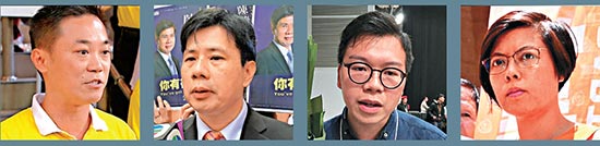 图:反对派去年策动雷动计划,企图操控选民,在立法会选举中为反对派配票。(左起)新民主同盟关永业、公民党陈琬琛、民协何启明、工党胡穗珊等反对派候选人阵前宣布弃选