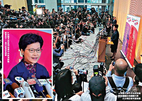 林郑月娥昨日下午五时在政府总部会见传媒,过百名中外记者一早到场守候。身穿红色旗袍、配上深紫色大衣及黑色高跟鞋的林郑月娥于五时准时抵达现场,交代辞职一事。
