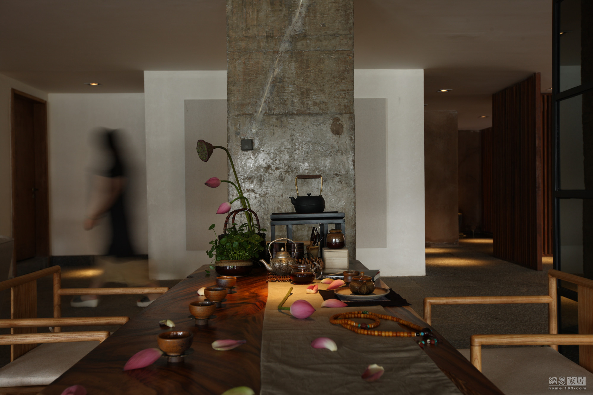 踩着老青石做的汀步迂回进入室内,便到了酒店接待和主要的公共活动区域。受限于建筑原有墙、柱的阻隔,空间并不方正、完整,但反而激发了设计师如泉的巧思、将空间善加利用,打破传统功能空间生硬的划分形式,将接待、品茗、香道、书吧、餐饮、会议及精品店等功能空间有机的组合在一起,用家具、片墙、层架等手段进行限定和划分,使得空间过渡自然、层次丰富而有序。同时在空间设计中借鉴了传统园林借景、框景的手法,让室内各处均具有良好的观景视线。