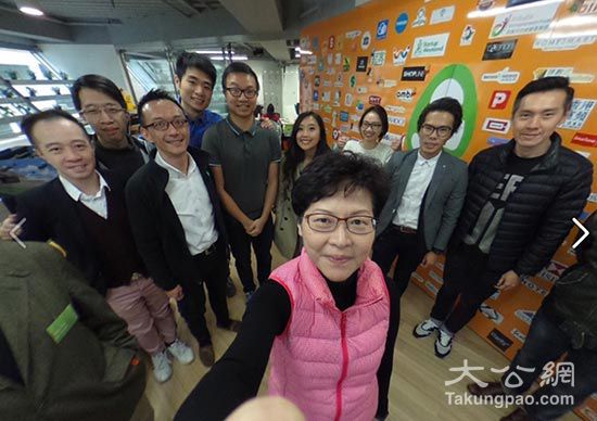 图:林郑月娥昨日与一些初创企业人士会面,还与在场人士以自拍方式拍摄360度全景照片。刘鸣炜facebook图片