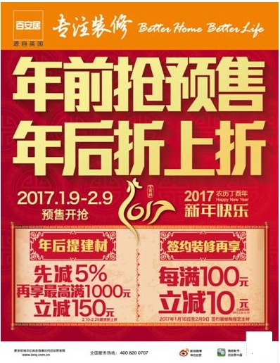 当然这些还不够!百安居在新年之际还会送上双重好礼,除了预售福利外,签约装修也有优惠可享,让今年的春节过得更有幸福感。在1月16日至2月9日期间,顾客只要与百安居装修设计中心签订线下整体装修订单(百安居装修套餐定单除外),并实际由百安居施工队施工,且其预算材料费、决算材料费均大于或等于5万元的客户,则可享受2月10日至3月19日期间百安居商场针对家装客户*主材指定商品每满100元减10元的优惠活动。猴年最后的优惠末班车岂容错过?快快行动吧!