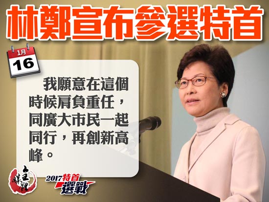 1月16日讯 1月16日下午五时,林郑月娥与其竞选办主任陈智思,在湾仔会展中心举行记者会,正式宣布参选下届香港特别行政区行政长官。她表示愿意在这个时候肩负重任,和广大市民一起同行,再创新高峰。林郑月娥感谢家人支持,但就希望传媒尊重其家人私人空间。