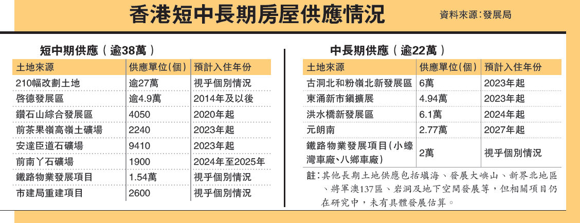 现届政府致力增加房屋土地供应,行政长官梁振英任内最后一份《施政报告》,以近6000字篇幅大谈房屋及土地利用。觅地建屋方面,政府新近物色到额外25幅用地,大部分预期可于2019/20至2023/24年拨作房屋发展,兴建超过六万个单位,当中超过八成是公营房屋。政府已公布的190幅具发展潜力用地,93幅已完成改划或拨作房屋发展,21幅亦已开始改划。整体而言,政府透过改划土地用途及增加发展密度,短中期可提供逾38万个单位,连同各个新发展区及规划中的潜在铁路物业发展项目,短中长期料可提供逾60万个住宅单位。