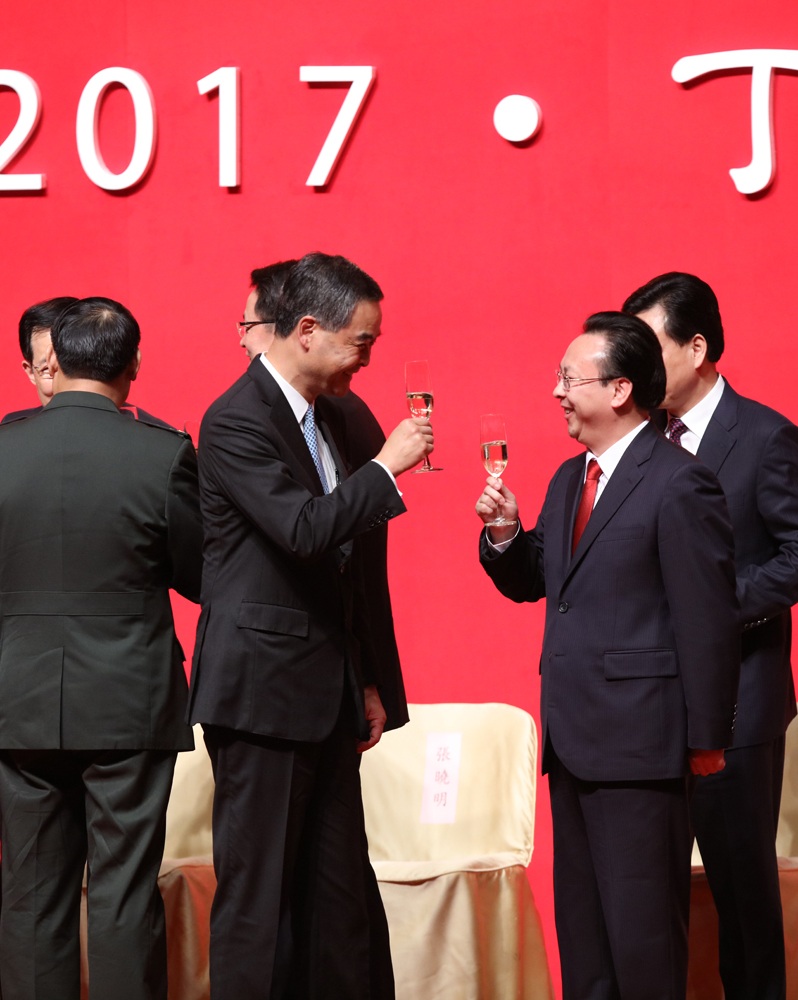 图:谭铁牛(右)与梁振英在新春酒会上谈笑甚欢