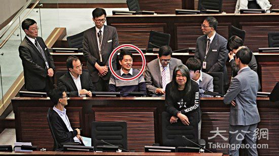 民主党许智峯(红圈示)被逐离场,部分反对派议员却围着许智峯,阻止保安将许智峯带离现场,会议被迫暂停。大公报记者林少权摄