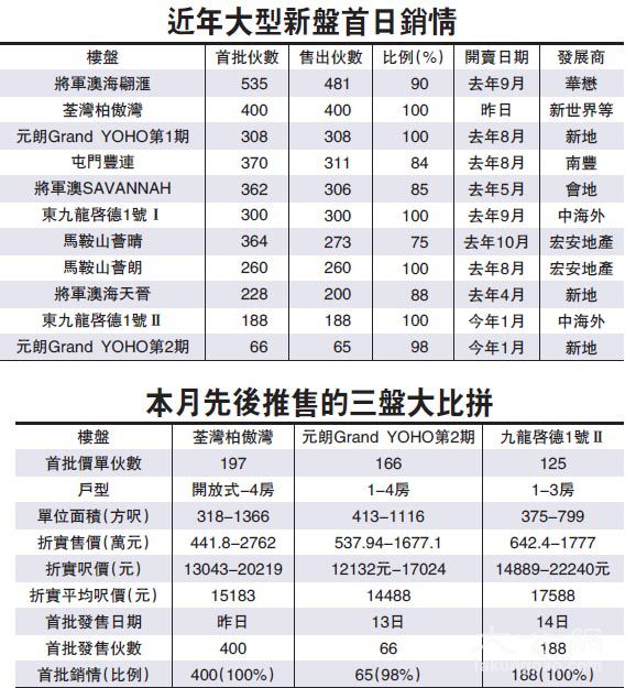 大公网1月21日讯(记者 梁颖贤)《施政报告》集中着墨搵地增供应,未有提及加辣压楼价,一手市场即时醒神。猴年最后一场铁三角大战打得火热,新世界(00017)等集团第一击荃湾柏傲湾响头炮,挟贴市价出击大收旺场,发展商公布400伙沽清,套现36亿元,售出伙数为去年九月将军澳海翩汇首日卖481伙之后的四个月最劲,近20组大手扫货,其中最贵四房以折实价2762万及尺价2万元售出,破尽区内标准户新高。即晚添食199伙,平均折实价16188元,较首批上调2%。连同元朗Grand YOHO 2期及东九龙启德1号Ⅱ,三盘一周卖逾700伙,吸金逾60亿元。