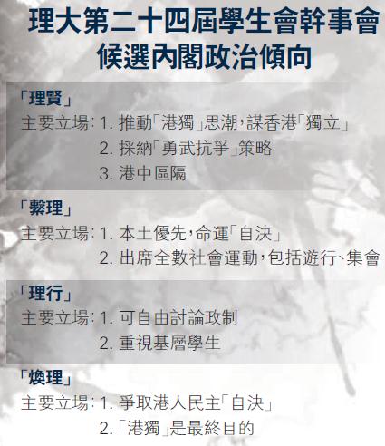 大公网1月24日讯(记者齐正之、张得民)新年伊始,本港各大学校园陆续换庄(选出新一届学生会),一如所料,多个学生会依然由港独庄(又称自决庄)把持或者参选。其中,理工大学今年更出现四支庄竞逐的情况,为求出位,有自封勇武抗争的独庄头目在竞选时声称,日后在带领学生参与和平示威时如发生暴力事件,会立即宣布解散,任由参与者独立行动,之后发生的事情均与学生会无关。