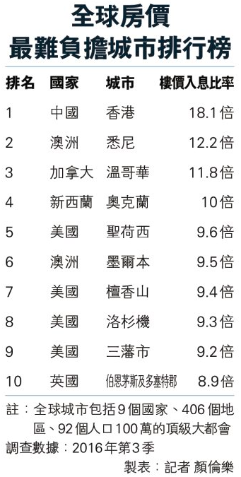 大公网1月24日讯(记者颜伦乐、梁悦琴)香港楼价之贵已是众人皆知,但实际情况有多离地呢?据美国顾问公司Demographia最新公布《全球楼价负担能力报告》,香港平均住宅楼价相当于家庭税前收入中位数竟达18.1倍,虽然较去年19倍有所好转,但已经连续7年成为全世界最难负担的城市,抛离排第二的澳洲悉尼的12.2倍成条街。假设楼价及工资都不变,一个刚毕业的22岁大学生,都要唔食唔用到近40岁才可凭一己之力买楼。