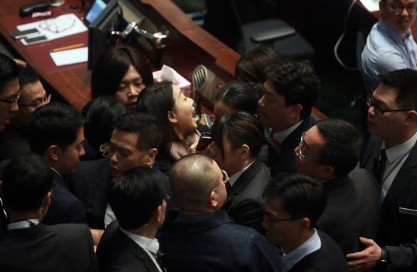 图:女保安员将刘小丽带离议事厅时,被多名反对派议员围堵阻止,场面相当混乱/大公报记者麦润田摄