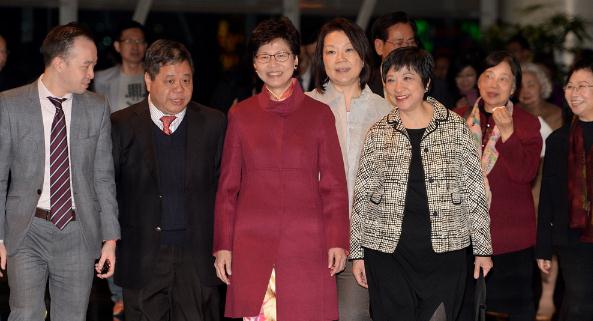 图:林郑月娥(左三)昨晚出席中联办新春酒会,很多与会者争相和她合照,并向她讲加油打气/大公报记者林良坚摄
