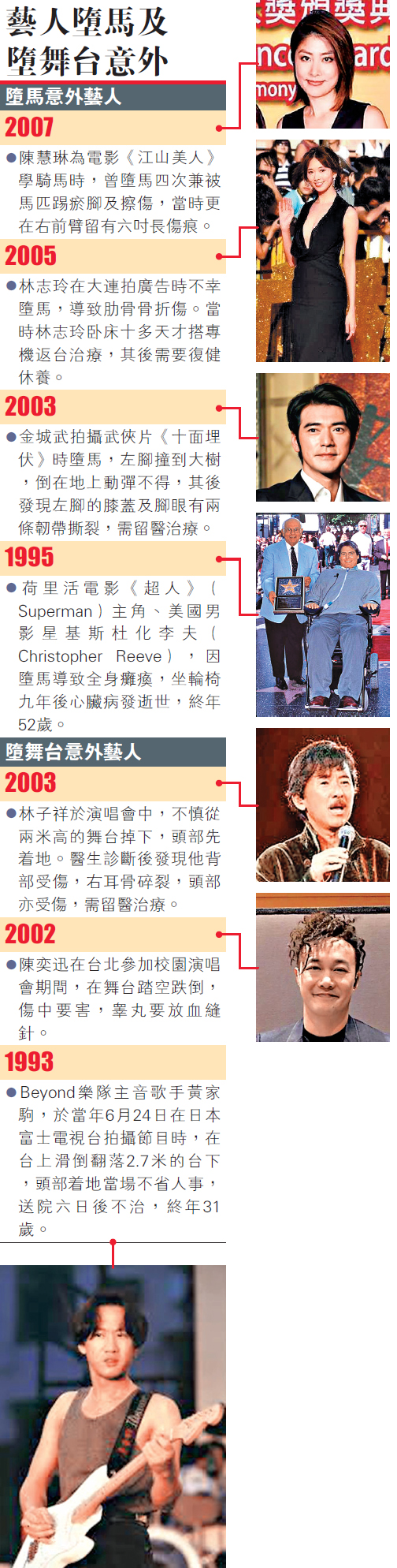 于2005年在内地大连拍广告时,也曾堕马不幸受重伤的台湾第一名模林志玲,得悉华仔受伤,昨于其微博贴上华仔的照片,并留言送上祝福:我们的英雄华哥,请一定要快快好起来!大家集气祈祷之后再贴上一个喊喊表情符号!