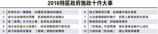 大公网1月25日讯(记者龚学鸣)由香港大公文汇传媒集团等多家传媒机构主办、恒基兆业地产集团独家贊助的2016特区政府施政十件大事评选,昨日公布评选结果。旺角暴乱成为最多人投票选出的十件大事之一,食水含铅事件、政府对青年新政梁颂恆和游蕙祯提出司法覆核,以及淘大迷你仓大火亦榜上有名。